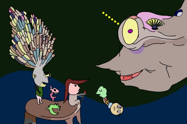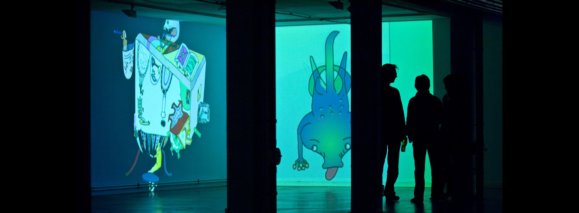 Featuring drawings, animations, video projections, and inflated sculptures of quasi-figurative characters engaged in a series of bizarre and unruly power struggles. Part Hieronymus Bosch, part Hello Kitty, Hwang’s fully-realized characters reign over a fantastical universe where, according to the artist, “they mutate, make love, eat, defecate, kill, or simply move in endless circles for all eternity.”