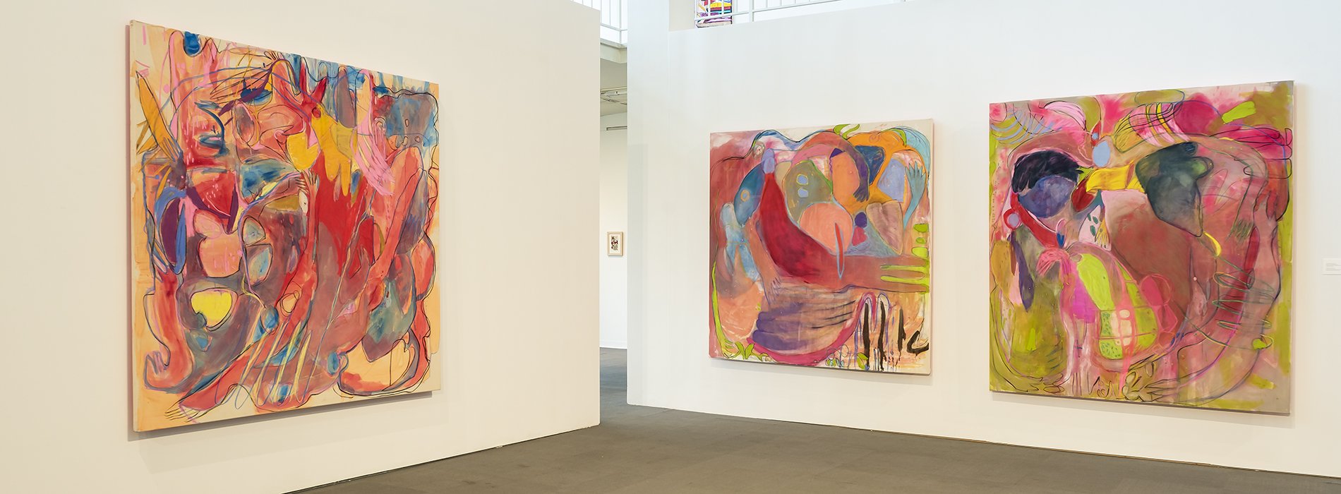 Carolyn DiFiori Hopkins, Three Sisters Pink Quilt Laughing, 2019, Acrylic, oil, infra graffiti spray paint, neon chalk pastel, and charcoal on canvas; Super Fun Bubble Wand, 2019, Oil paint mixed with chalk pastels and charcoal on canvas; Tripping the Light, 2019, Acrylic, oil, infra graffiti spray paint, neon chalk pastel, and charcoal on canvas.