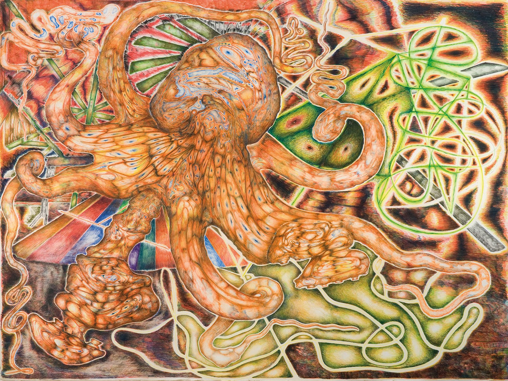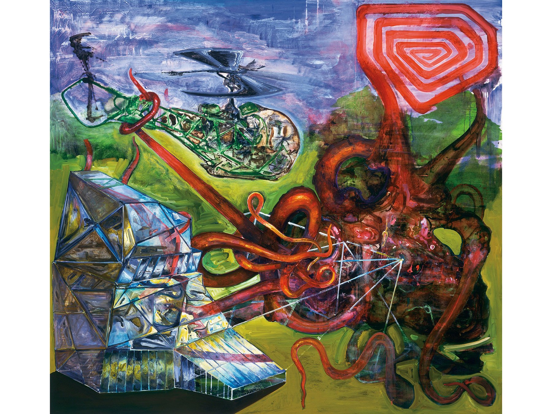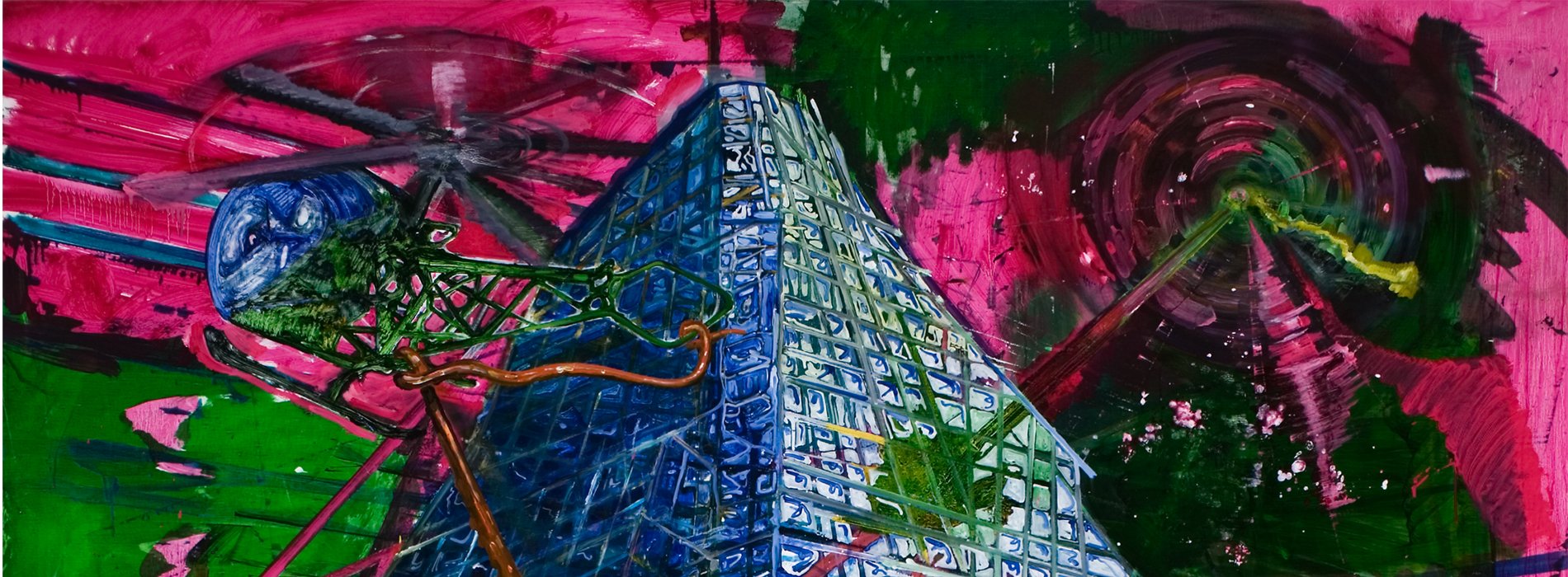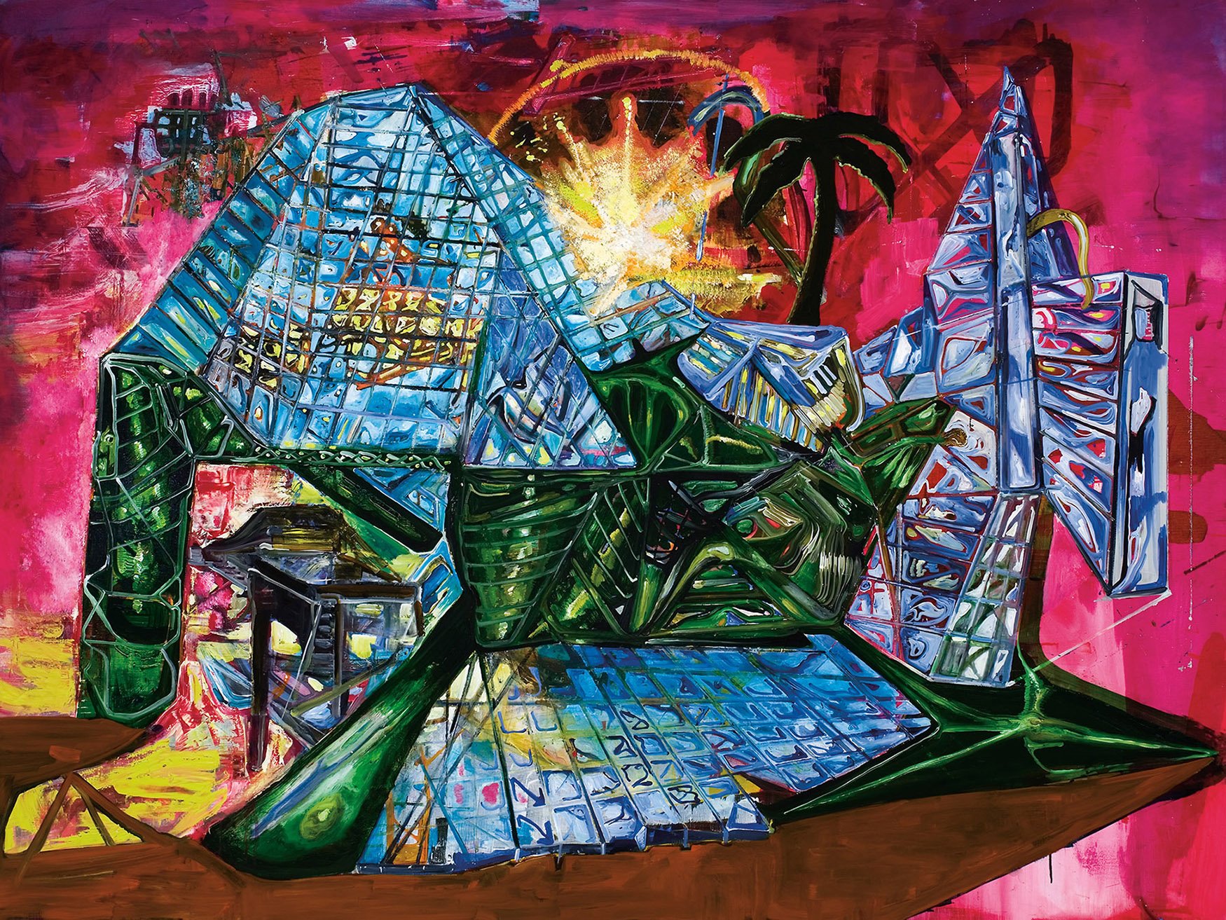 Steve DiBenedetto's exhibition includes recent paintings and drawings that continue to plumb the motifs and idiosyncratic subject matter for which he is known. His reoccurring motifs include octopi, ferris wheels, carousels, blasted television sets, and more recently, generic office buildings with mirrored facades.