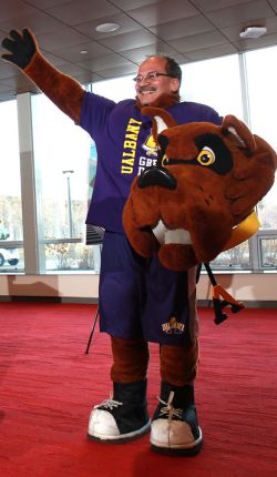 President Havidán Rodríguez went undercover as Damien the Great Dane at the event, greeting campus community members, and even his wife, Rosy, who all had no idea it was him under the mascot costume. The president revealed himself just in time to display UAlbany’s holiday card for this season.