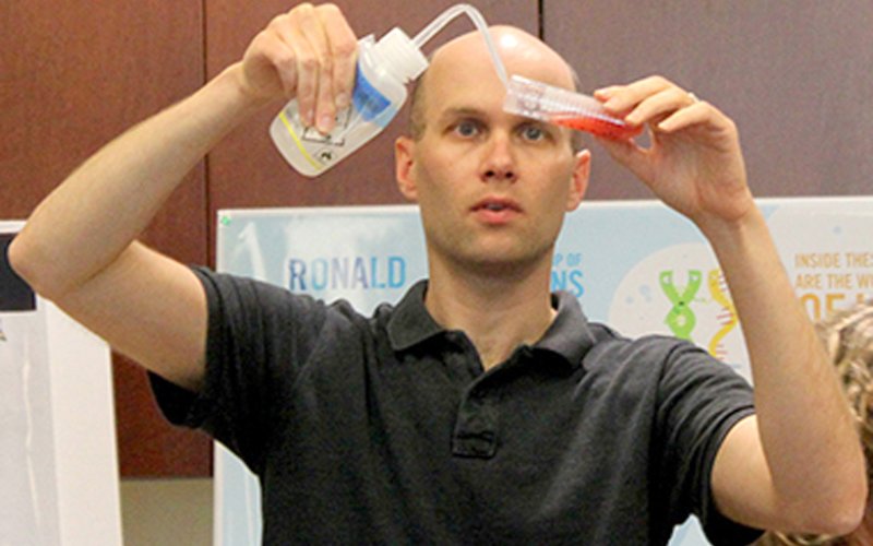 Ken Halvorsen, shown here extracting DNA from strawberries at an RNA Community Day, is a senior research scientist at the RNA Institute.