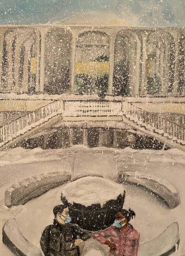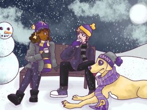 Senior Biology major Nova Turner won a $650 scholarship for her design of a snowy Podium with two students, wearing facemasks and bumping elbows. Turner said the Podium was an obvious choice because it’s where students come together.