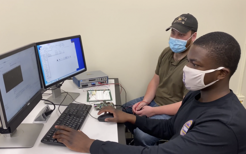 With most in-person collaboration limited due to COVID-19 restrictions, the team of Merciful Ajayi, Jon Fronckowiak, Allanah Matthews and Sean McNessor set up a virtual environment that could simulate the conditions in which Naval nuclear reactor elements need to be capable of functioning. Working with engineers at Knolls Atomic Power Laboratory, the students presented their findings on a “Multipurpose FPGA Detector Emulator,” as part of the senior capstone presentations this month for CEAS.