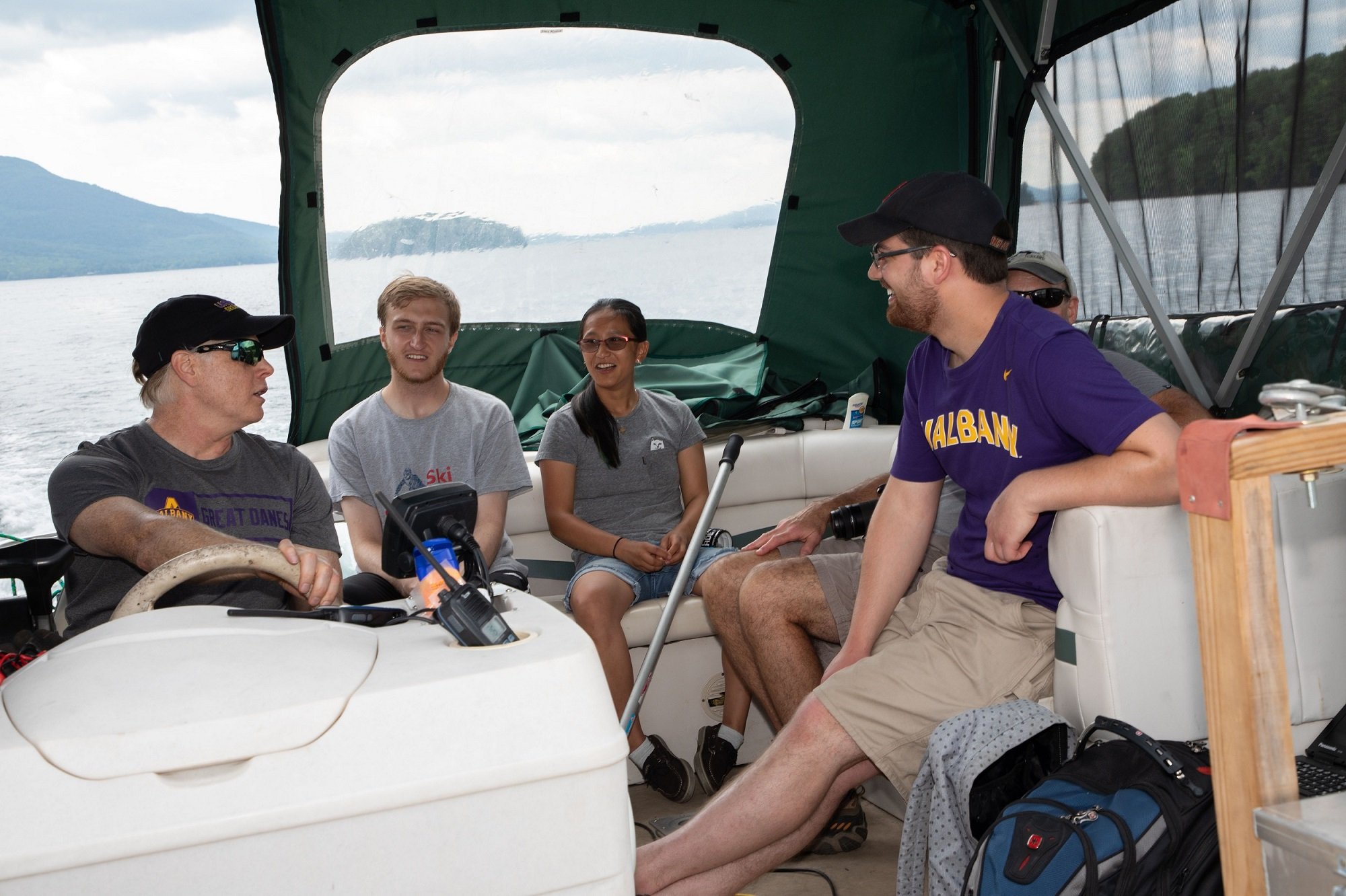 "It is always great fun to collaborate on novel projects. I believe that this project with the ASRC has a great future in collecting data that synergize with those data collected by the Jefferson Project," said David Diehl, site manager/coordinator of RPI's Darrin Fresh Water Institute at Bolton Landing, where the pontoon boat was docked. "In addition, the full-circle connections between the ASRC, Irving Langmuir, Bernard Vonnegut, and Crown Island made it that much more rewarding. Projects such as this are all about the planning, the people and the connections."