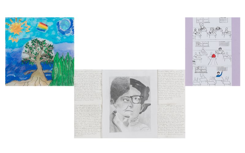 Some students’ art reflected the marginalization they felt in school and of what they had been missing in their educations. The artworks often reflected the dream of something better. One 10th grader, who created the piece “My Asian American Dream School,” noted she had not read a book by or about an Asian American in all her years of public schooling. 9th grader Chloe Tyson created a montage of Ida B. Wells, Claudette Colvin, Lucretia Mott and Mary Church Terell called “Four Lesser Known Heroes” and wrote she hoped the work would bring people to explore "some historical figures that we don’t usually talk about in the classroom.”
