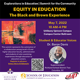 This pilot project culminates in an educational summit, Equity in Education: The Black and Brown Experience, on May 7 from 10 a.m. to 4 p.m. in the Campus Center Ballroom. Participants will include educators in practice, UAlbany faculty, professionals and students, Capital Region high school students and community collaborators and stakeholders.