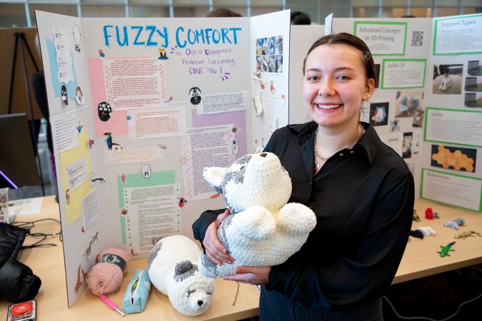 Daria Kolmogorova, a sophomore emergency preparedness, homeland security and cybersecurity major, has spent the semester crocheting weighted stuffed animals, including a few she brought to showcase.