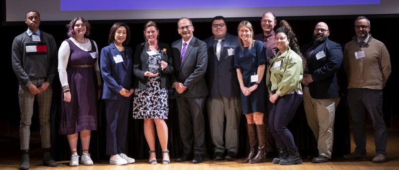 The winners, along with their colleagues and deans, were celebrated at a reception and awards ceremony in the Performing Arts Center, hosted by President Havidán Rodríguez along with Provost Carol Kim and Director of Public Engagement Mary Hunt.