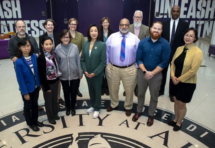 The 2023 Leadership Academy are (front, left to right) Yu-Hui, Youqin Huang, Mila Gascó-Hernández, Provost Carol Kim, Robert Miller, Alex Greer and Angie Chung. Back, left to right are Sean Rafferty, Kimberly Colvin, Julia Hormes, Associate Vice Provost Christine Wagner, Eric Hardiman and Associate Vice Provost Glyne Griffith.