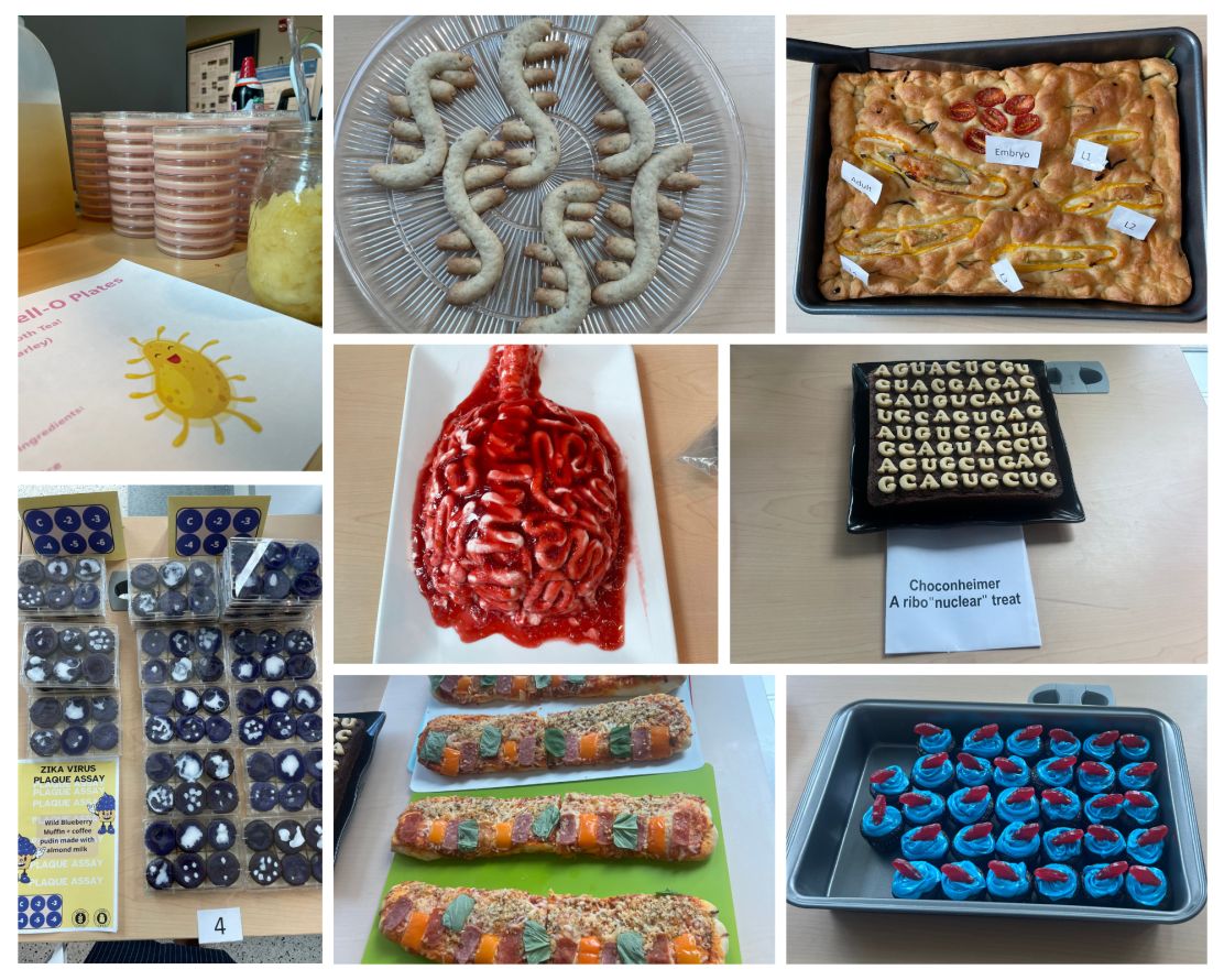 Other inspired entries this year included: Jell-O petri dishes, “Mitochondria munch: Oxidative stress buster cake,” a Zika virus plaque assay made of blueberry muffins streaked with coffee pudding, “Choconheimer brownie: A ribo ‘nuclear’ treat,” and a depiction of the lifecycle of C. elegans illustrated in vegetables arranged on focaccia bread.