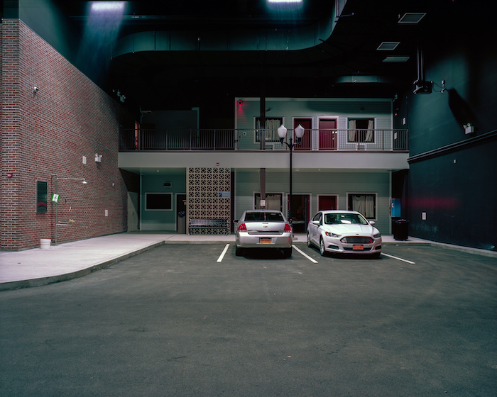 Works such as the seven-foot-high City Drugs, Cityscape Simulator, State Preparedness Training Center, Oriskany, NY (2019) was shot with a 4x5 view camera and appears to depict a generic American “Main Street” town. But the courthouse, drug store, motel and shops captured in the image are not real and are actually used to train security personnel for emergencies and disasters.