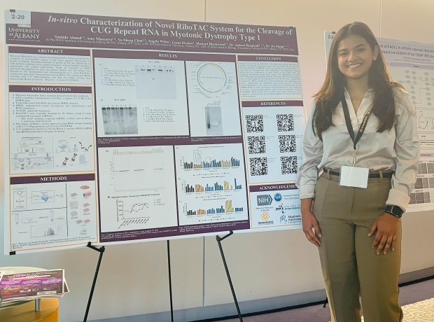 "This summer, I studied myotonic dystrophy at a genetic level under the Sheng Lab with an amazing mentor, Amy Merritt. We worked on a project involving a system called RiboTAC (ribonuclease targeting chimera), which was originally designed by another lab to cleave, or stop, cancer-causing RNA," said Ahmed. "Our research team modified the process to cleave the RNA in cells involved in myotonic dystrophy.