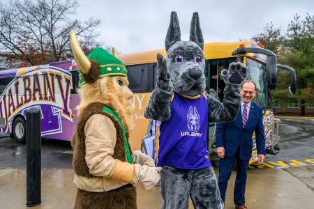 As Rodríguez and the UAlbany mascot, Damien the Great Dane, got off the bus, they were greeted by the HVCC mascot, Victor the Viking. Next off the bus were the University’s executive council, deans, student affairs leaders, faculty, students and staff. Once inside the Seik Campus Center, they were joined by a similar group from HVCC, as well and the SUNY Chancellor and his staff, local media and area elected leaders.