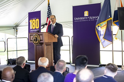 “This building is a physical manifestation of UAlbany’s steadfast commitment to Albany and our optimism for our region’s high-tech future,” said UAlbany President Havidán Rodríguez. “UAlbany has called this block home for more than a century. Today, as we mark our 180th anniversary we are bringing some of our most in-demand, research-intensive programs to the heart of the city. Careers in engineering and computer science should be an option for everyone — and sometimes seeing is believing. We are so grateful to our elected representatives and other partners in the city and the state who helped make real our dream of giving our engineering college a state-of-the-art home that pays homage to our city’s history.”