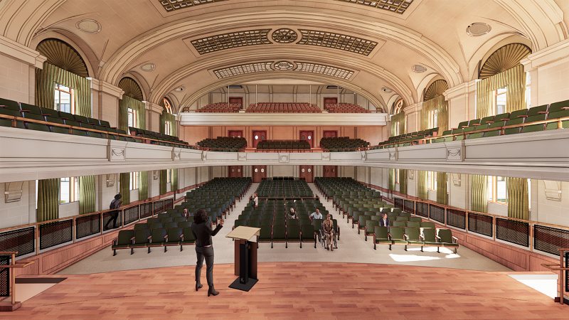 It also includes refurbishing the building’s grand central staircase off North Lake Avenue and the renovation and restoration of the stunning, 11,000-square-foot auditorium into a modern event space with about 760 seats on three levels. Once complete, the auditorium will be among the largest and most grand on campus.