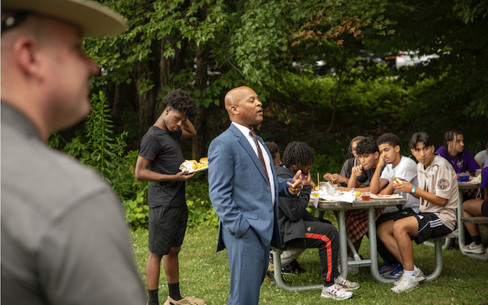 Students in the program, which provides admission opportunities for economically and educationally disadvantaged students from around New York state, took part in a ropes course at the park, then heard from State Police Superintendent and UAlbany alumnus Steven James, as well as other State Police members, about potential careers in law enforcement.