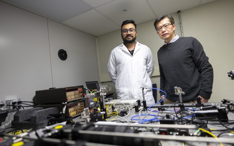 In order to develop his technology, Huang has utilized UAlbany’s unique Ion Beam Lab, where he and his graduate student, Sahyadri Patil, are using high-energy ion beams produced from a charged particle accelerator to create nanostructures within sapphire fibers that can function as an internal optical cladding in the conditions that the single-crystal sapphire fibers might face in extreme environments.