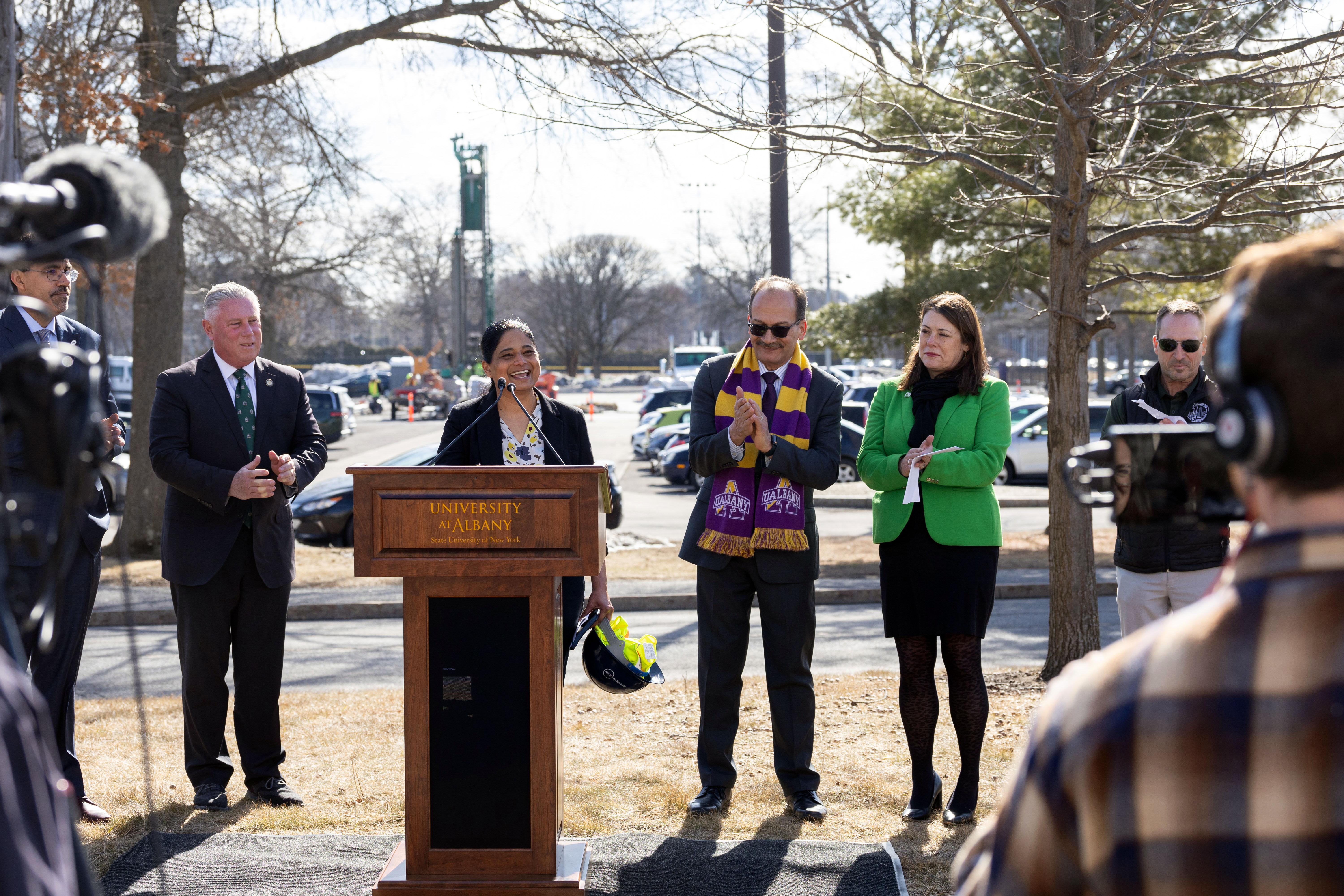 Ed Nadeau, business manager at New York State Pipe Trades, Local 7, said, “The New York State Pipe Trades and Local 7 are proud to be a part of New York’s leadership to decarbonize its buildings with thermal energy. The University at Albany has given my members the opportunity to work on cutting edge projects and use their skills to create more efficient heating and cooling systems that also create a cleaner environment. Today is the beginning of the creation of a thermal energy network on this campus. Local 7 will be here along with the other trades to bring this network to life. I would like to thank UAlbany, especially Indu, who had the vision to see the vital role that thermal energy networks can play in creating a more efficient and cleaner energy grid for this campus. I would like to thank Gov. Kathy Hochul, Sen. Fahy, Assemblyman Steck and McDonald for securing the funding to make this chiller plant a reality. Today this test drilling shows we can decarbonize our state, improve energy efficiency, and create union jobs that power the middle class.”