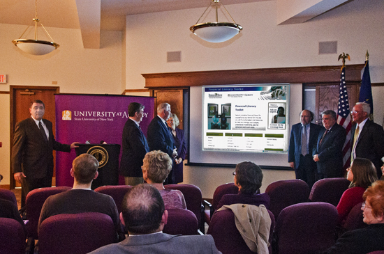 UAlbany President George M. Philip (left) unveils the Financial Literacy Toolkit for for project partners from Berkshire Bank, Senator Neil Breslin and Assemblyman Jack McEneny, and SSW representatives Dean Katharine Briar-Lawson and Professor Philip McCallion.