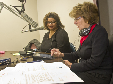School of Social Welfare graduate student Candi Griffin-Jenkins and nationally known radio personality Kathryn Zox on the air. (Photo Mark Schmidt) |