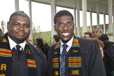 Emmanuel Adomfeh, right, celebrates Commencement 2011 on May 15 with Uzezi Obaro-Best, co-founder of Third World Impact. (Photo Mark Schmidt) |