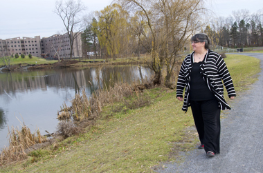 Katherine Czajkowski, walking along Indian Pond, returned to school as a wife and mother for a UAlbany degree in urban studies. She graduates this Dec. 3, becoming the Mohawk River Watershed Coordinator at Cornell University's Water Resources Institute. (Photos by Mark Schmidt)
