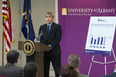 School of Business Dean Donald Siegel addresses business people and media at the release of the 26th Annual Marvin and Company/ University at Albany School of Business’ Business Climate Survey on Feb. 28.