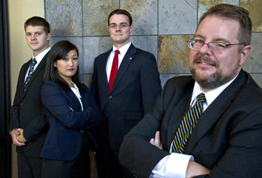 Students in the T-STeP program, left to right, Patrick Campion '11, Tina Chang and Joseph Popcun, stand behind the project's lead trainer, UAlbany associate professor R. Karl Rethemeyer, a policy and terrorism expert.