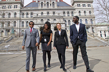 From left, UAlbany students Gow Mosby Jr., Erica Nkasiobi Akpaka, Cindy S. Ogando and Cecil Belfon Jr.are all interns in the New York State Legislature this semester. (Photo by Mark Schmidt) |