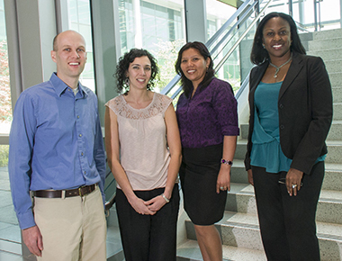 New to The RNA Institute are, left to right, Ken Halvorsen, Maria Basanta Sanchez, Lisset Drislane and Taryn Davila-Webster. (Photo by Mark Schmidt) |