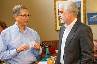 UAlbany Vice President for Research James Dias (left) speaks with Dr. Tim Killeen, president of the Research Foundation and SUNY vice chancellor for research, at a recent planning session on SUNY 4E. (Photo by Mark Schmidt) |