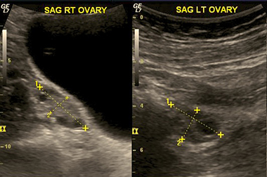 Left and right side ultrasounds of ovaries with developing follicles. |