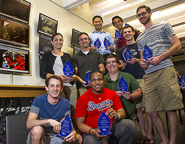 Front row, from left: Casey Peirano (graduate student), Ernesto Findlay (graduated spring 2014), Travis Elless (graduate student), Michael Fischer (graduate student) Back row, from left: Kristen Corbosiero (assistant professor), Ross Lazear (instructional support specialist and WxChallenge local manager), Brian Tang (assistant professor), Leon Nguyen (graduate student), Bill Lamberson (graduate student). Photo by Mark Schmidt. |