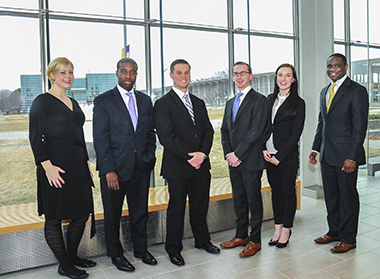 Recent UAlbany FMR alums, from left: Julia Baris (Ernst and Young), Maxwell Amoako (Goldman Sachs, formerly of FINRA), Jesse Johnson (formerly at FINRA and now at Northwestern Mutual), Ronald Benson (FINRA), Kathryn Pendergast (FINRA), and Basil Swaby, Jr. (FINRA), have all gone on to successful careers. (Photo by Mark Schmidt) |