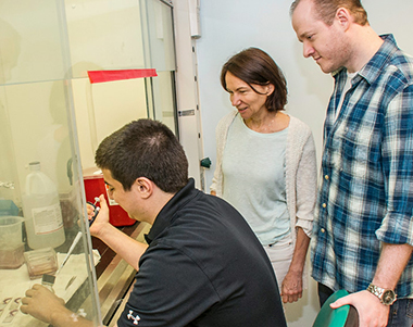 JoEllen Welsh, lead research on a newly funded NY CAP Research Alliance project, "Control of Inflammation-Associated Cancer by Vitamin D and CD14," instructs honors student Joseph D'Angelo, '16 (left) in her UAlbany Cancer Research Center lab as Welsh Laboratory research project assistant Don Matthews looks on. (Photo by Mark Schmidt) |