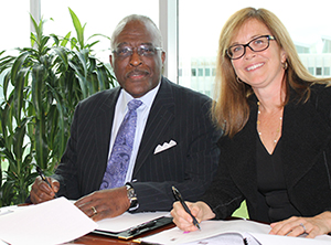 UAlbany President Robert J. Jones and Alicia Ouellette, president and dean of Albany Law School, sign affiliation agreement between the two institutions. (Photo by Mike Nolan)