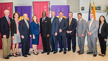Participants in the affiliation announcement were, left to right: Darius Shahinfar, Albany City Treasurer; State Assemblymember Patricia A. Fahy (109th District); State Senator Hugh T. Farley (49th District); Alicia Ouellette, President and Dean, Albany Law School; President Jones; Daniel P. Nolan, President and CEO, Hugh Johnson Advisors, chair, Albany Law School Board of Trustees; Michael J. Castellana, President and CEO, SEFCU; State Senator Neil D. Breslin (44th District); State Senator George A. Amedore, Jr. (46th District); Interim Dean David Rousseau, UAlbany College of Emergency Preparedness, Homeland Security and Cybersecurity; and Bethany Hicks, Albany Law School student. (Photo by Mark Schmidt)