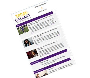 ALBANY, N.Y. (November 16, 2015) — This morning, the Office of Communications and Marketing unveils an enhanced daily email report, aptly entitled “Today at UAlbany.” It is designed to deliver even more University news, accompanied by photos and videos, while keeping the campus community abreast of important alerts, announcements and the day’s scheduled events. This new format will replace the former “Today’s News, Events and Announcements.”
