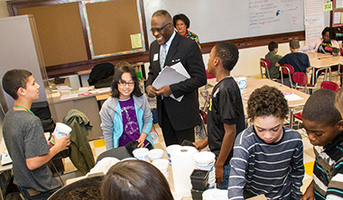 President Jones interacts with Hackett Middle School children at an Albany Promise "cradle to career" event in 2013. |