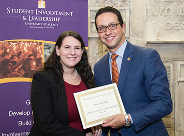 The program also maintains a partnership with Omicron Delta Kappa’s (the National Leadership Honor Society) UAlbany Circle. OΔK’s Emerging Leader award is given each semester to a program graduate who best exemplifies the five pillars of leadership — scholarship, athletics, service, media, and the arts. This semester’s recipient was sophomore Julia Alford.