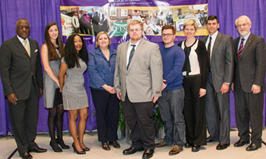 Representatives from the Center for Technology in Government and the state’s Office of Children and Family Services accept the President’s Award for Exemplary Public Engagement from President Robert Jones and Provost James Stellar for the creation of a peer-caller program that has greatly enhanced New York State’s ability to track young people after they leave foster care.