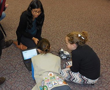 UAlbany ACM-W student chapter Vice President Nikki Gupta, working with local Girl Scouts at a robotics workshop.