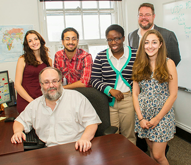 Student interns at the Center for Policy Research at Rockefeller College, mid row, left to right, Jona Hoxha, Alejandro Castro-Reina, Charmaine Wilson-Jones, and Kady Arthur, gather with Center Director Victor Asal, lower left, and Karl Rethemeyer, interim dean of the College.