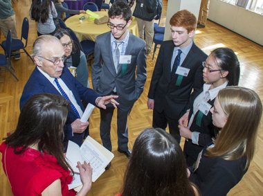 Dan Wulff, Upstate New York Junior Science & Humanities Symposium co-director and professor of biological sciences, congratulates this year’s high school winners at the event. (Photo by Mark Schmidt) |
