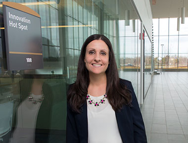 i518 Associate Director Maria Pidgeon stands outside her office in the Massry Center for Business. (Photo by Paul Miller)