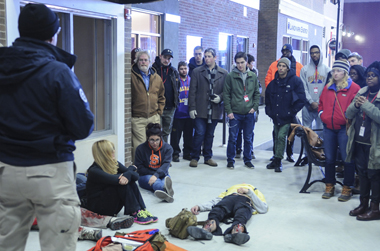 CEHC students and Interim Dean David Rousseau (leaning on wall) observe a simulation of a coordinated and complex terrorist attack at the State Preparedness Training Center "Cityscape." Training role players portray fallen victims, and EMS and FDNY Lieutenant Carlos Lopez (back to us) explains the details of the scenario and response. |