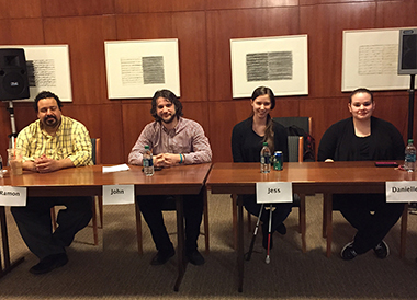 SSW student participants in The Gathering's Ableism panel, left to right, doctoral candidate Ramon Guerrero, MSW candidates John Durden and Jess Perk, and undergraduate Danielle Hotaling. |