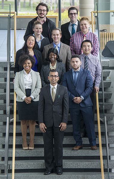 Sanjay Goel, with graduating digital forensics major students and IFM faculty. Clockwise from upper left, Nicholas Manzella, Peter McCarran, Tonja Alvis, Yuan Hong (faculty), Edwin Morales-Roca, Victoria Kisekka (faculty), Rosa Bautista, Damira Pon (faculty) and Christina Seahorn. In the middle is Justin Giboney (faculty). (Photo by Mark Schmidt) |