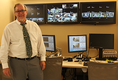 Matt LaFave stands in the command center of the Patient Safety and Clinical Competency Center at Albany Medical College, where student teacher interactions with "simulated parents" can be observed. (Photo by Beth A. Skrobela) |