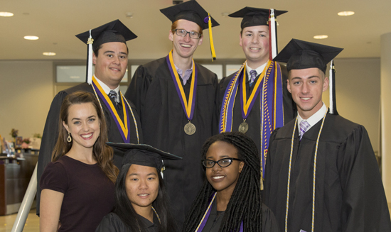 The first graduating students with minors in Emergency Preparedness, Homeland Security and Cybersecurity, clockwise from left, (CEHC assistant Dean Elizabeth Gray), Dan Giannettino, Greg Bedik, Tyler Grodin, Anthony Cone, Jhilene Walker and Joeie Lum. Not pictured: Phil Waknin. (Photo by Carlo de Jesus)